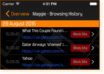 Wild will also, by default, block any pages that are classified as 'RTA' (Restricted To Adult) or ones that cause a 'hit' against any of the default blocked keywords within Protecteon. "Porn" or "gambling" for example! And because Protecteon shows you a LIVE log of every page your child has viewed, you can review this log and block any sites you feel have slipped through the net by touching a 'Block' button next to the item in the log (as shown in the image).